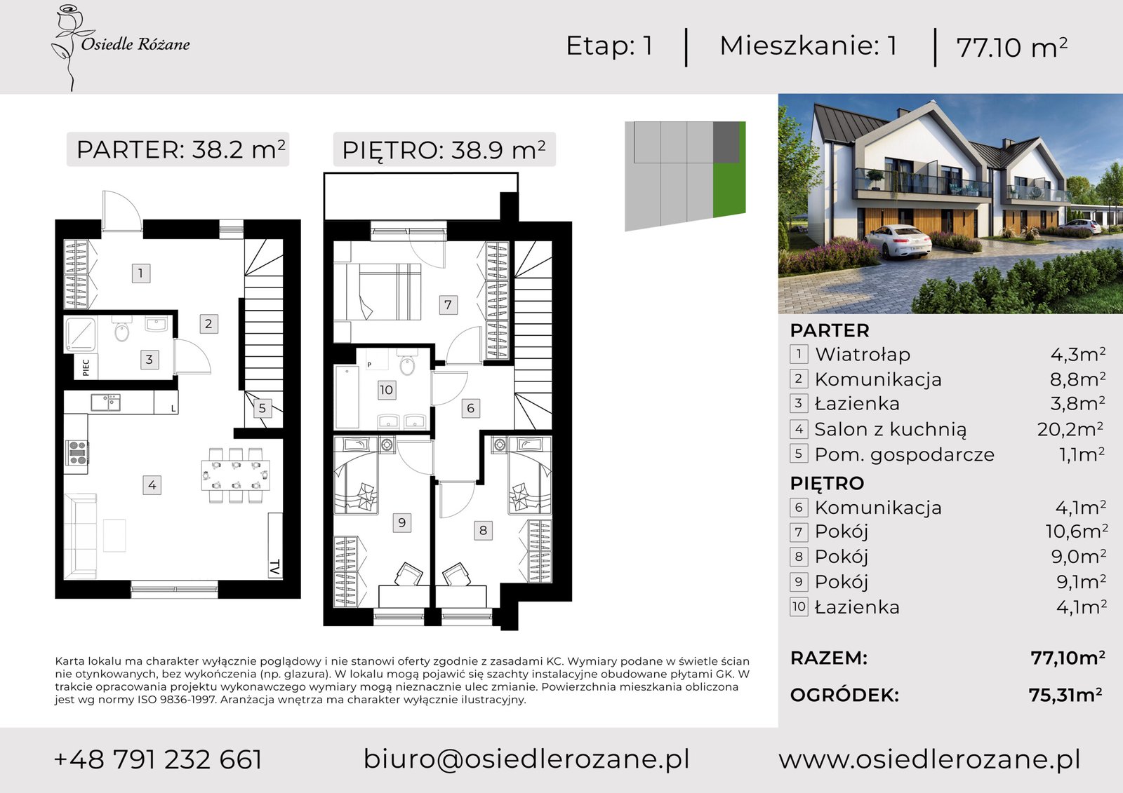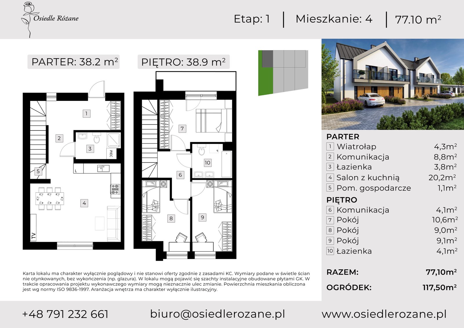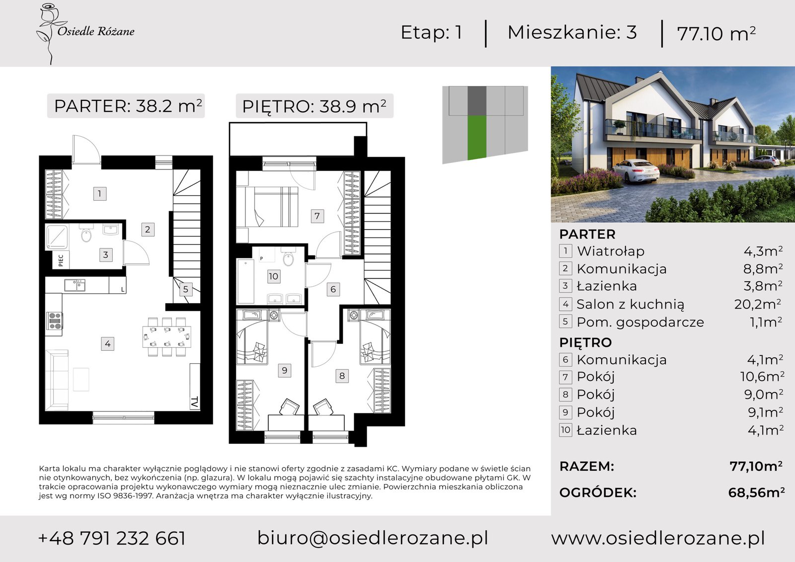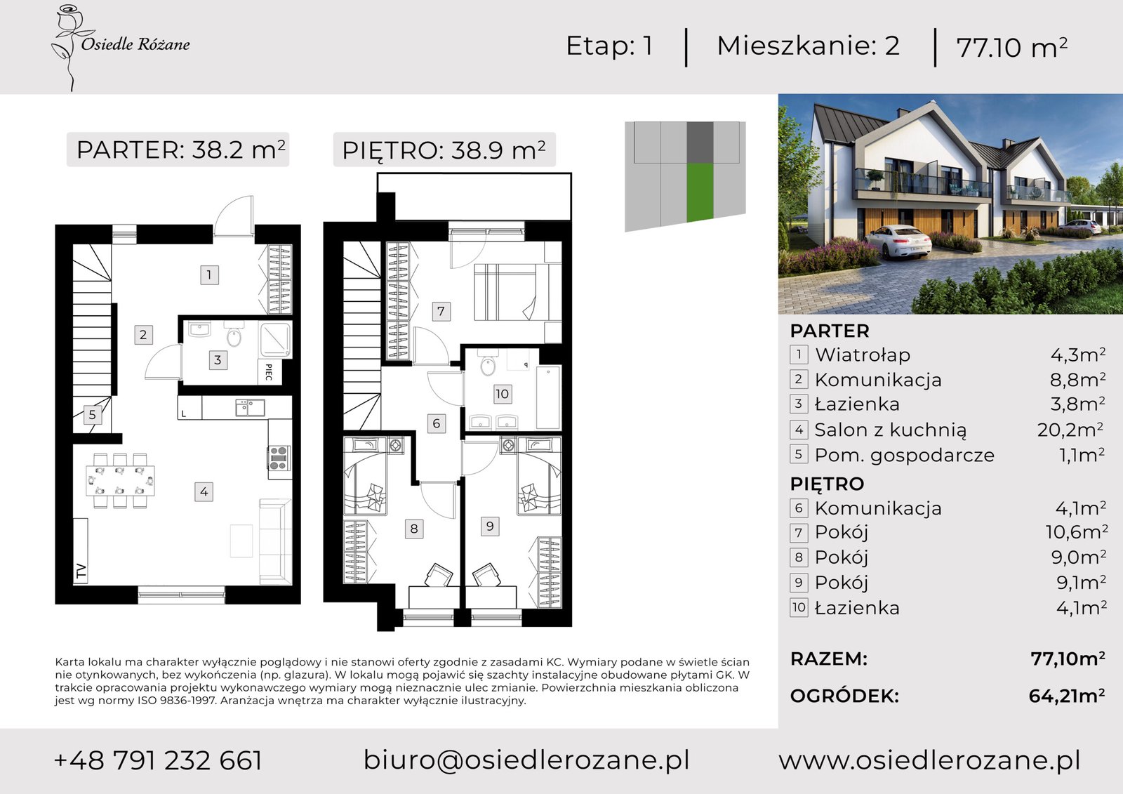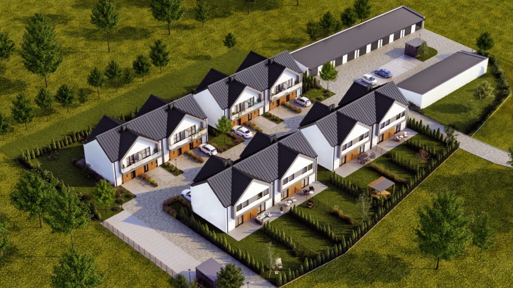 ok 77 m² każdy. Układ osiedla tworzy zamkniętą, uporządkowaną przestrzeń z ograniczonym ruchem wewnętrznym.